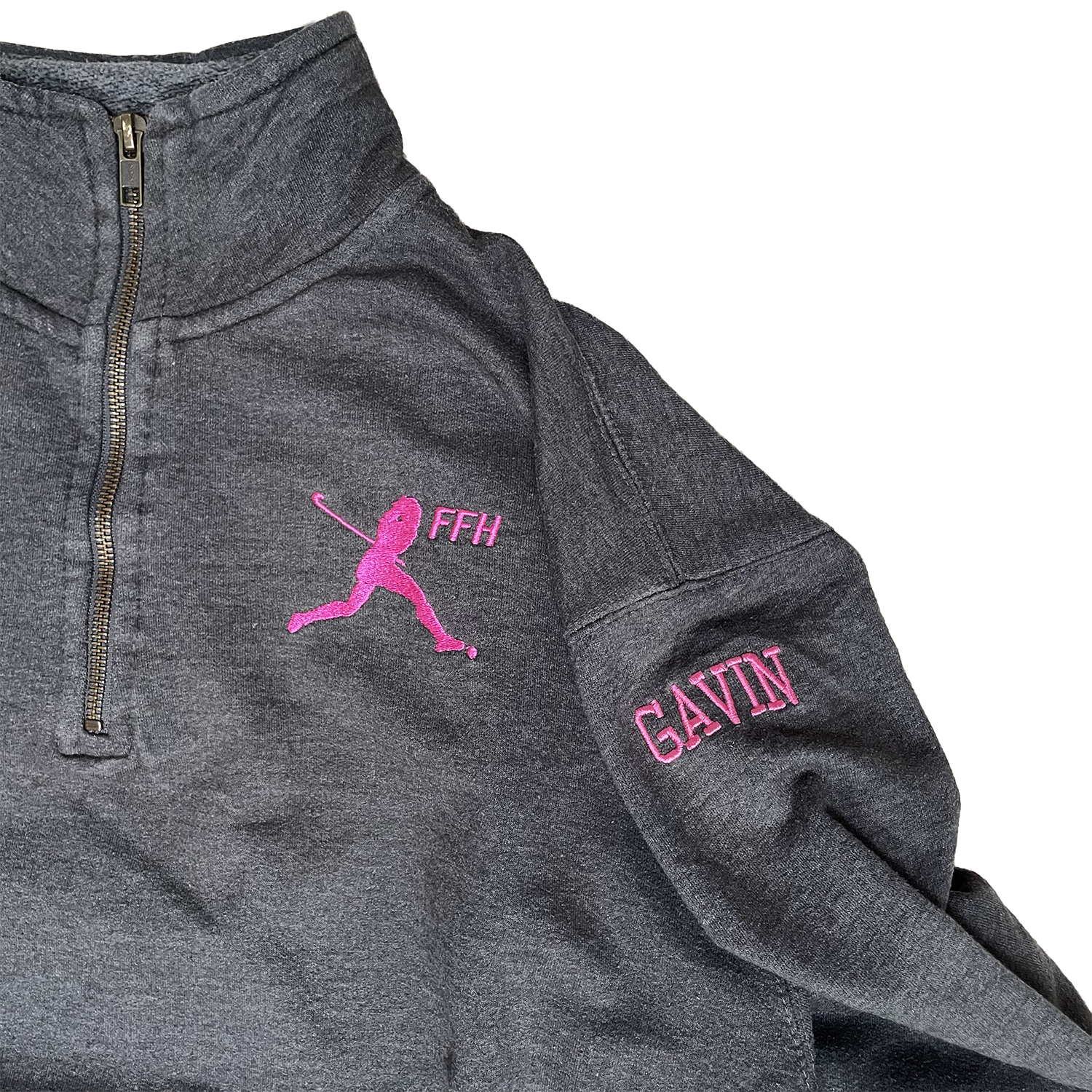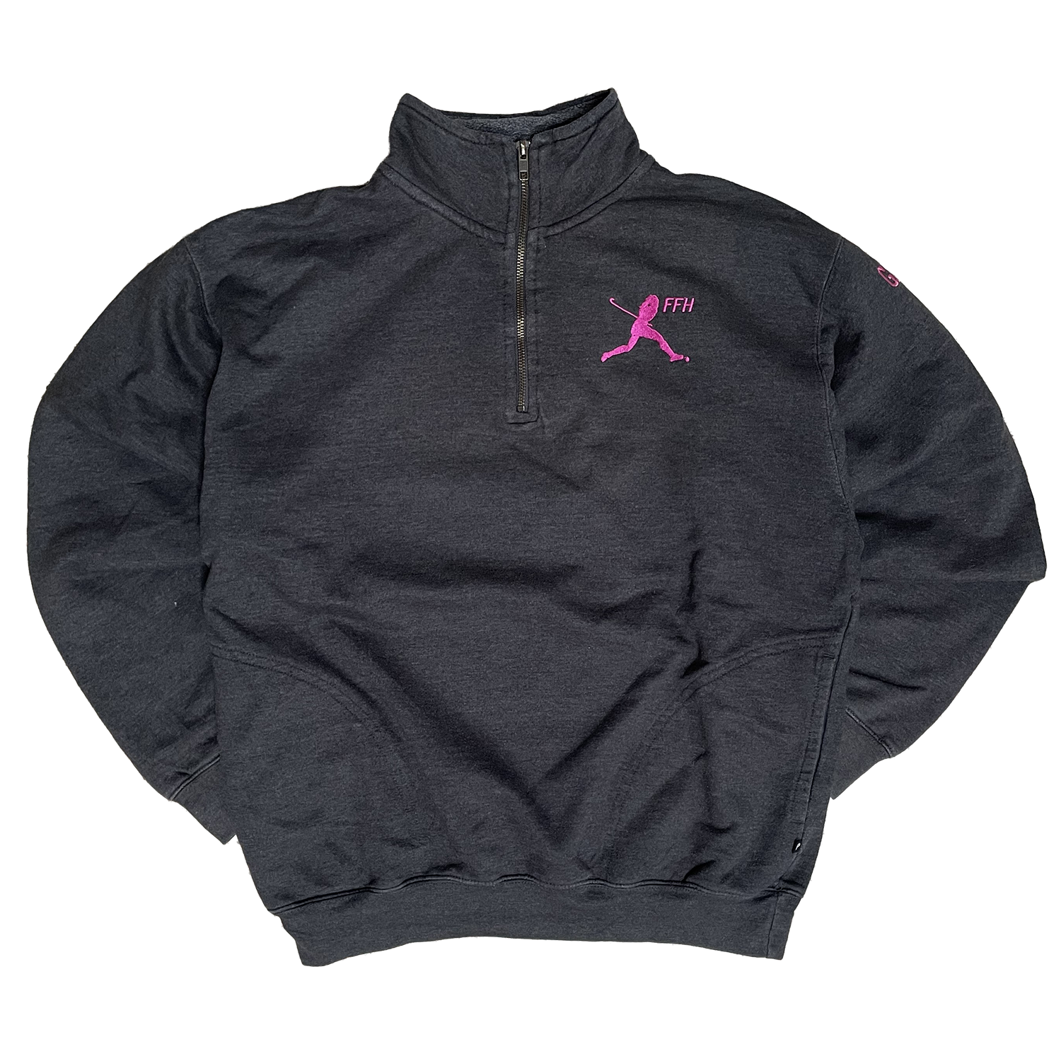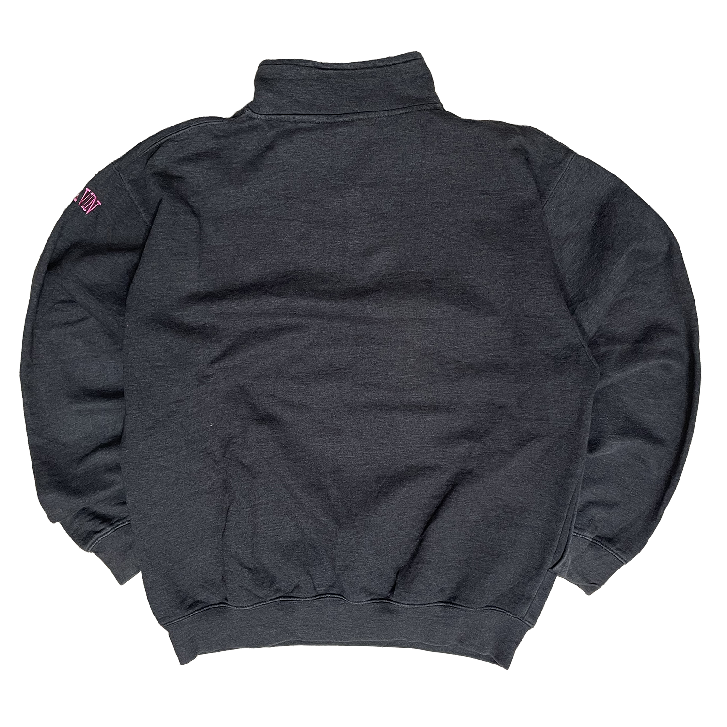 Sweat gris foncé avec col. Petit logo rose à l'avant. Taille M. Grade A.