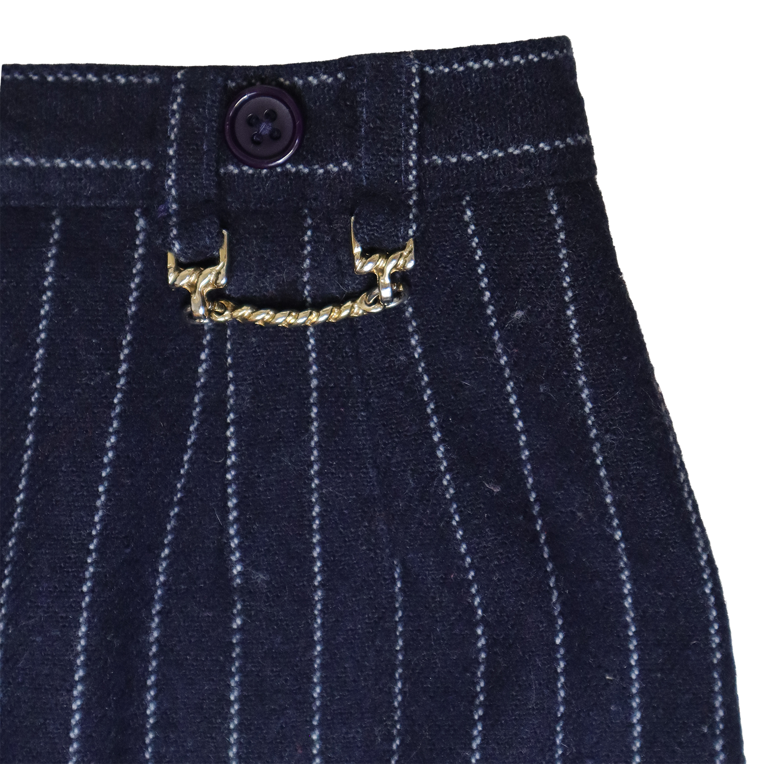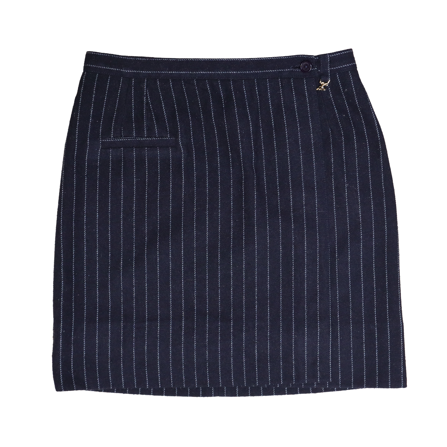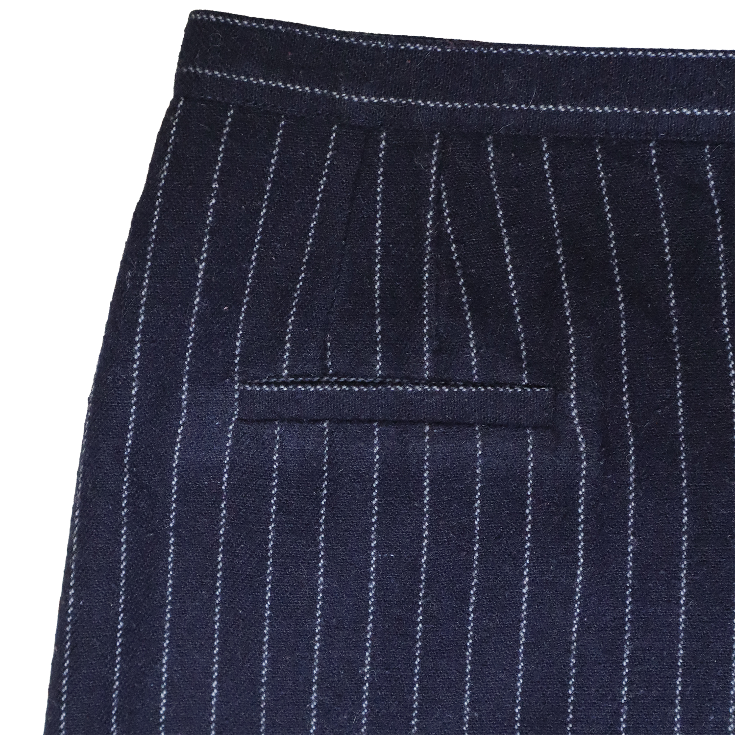 Jupe courte portefeuille avec détail doré. Bleu marine lignée. Plus d'étiquette de taille ou de marque. Matière épaisse. Très certainement taille S.