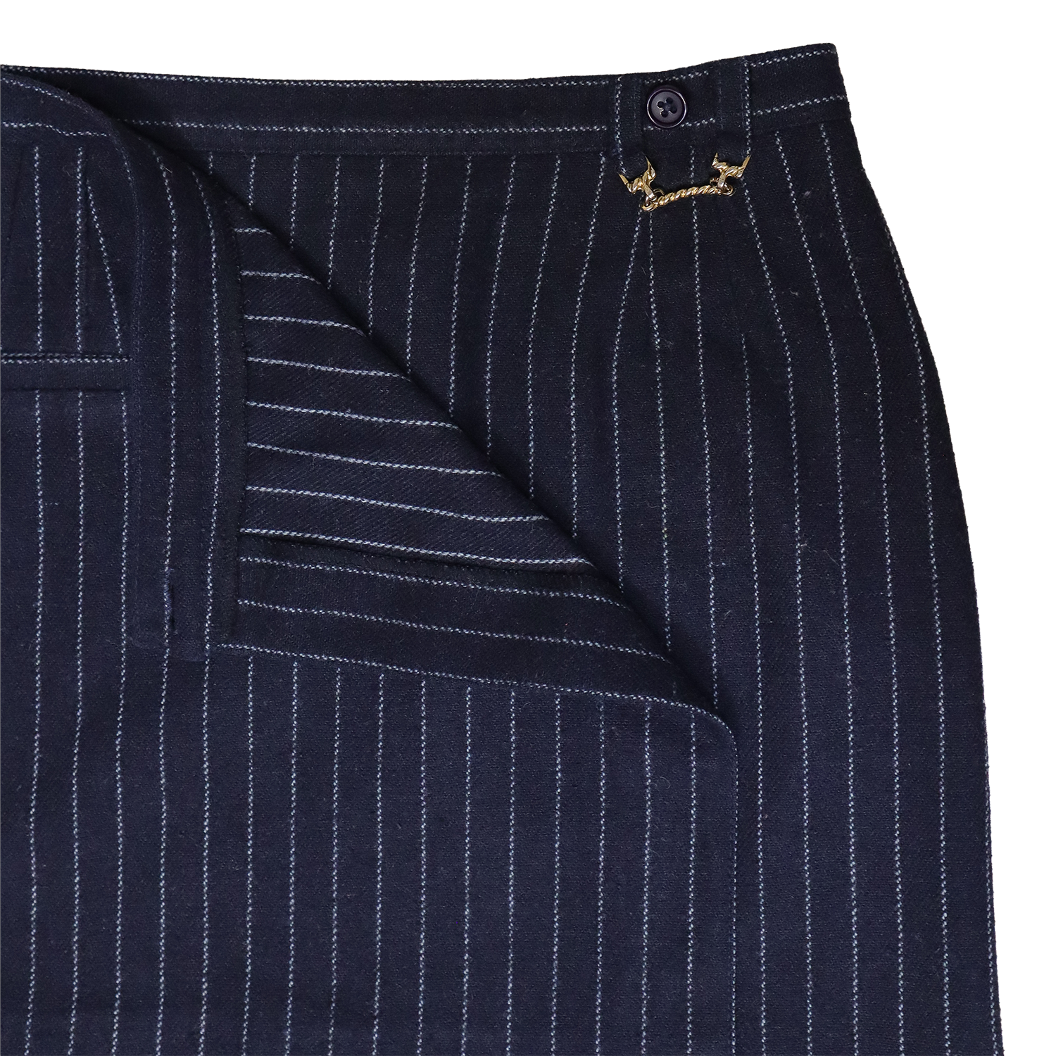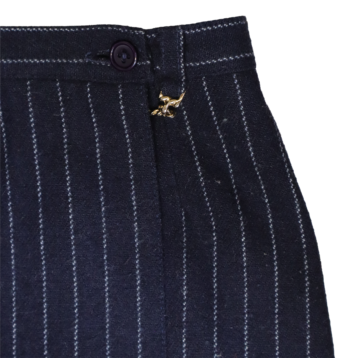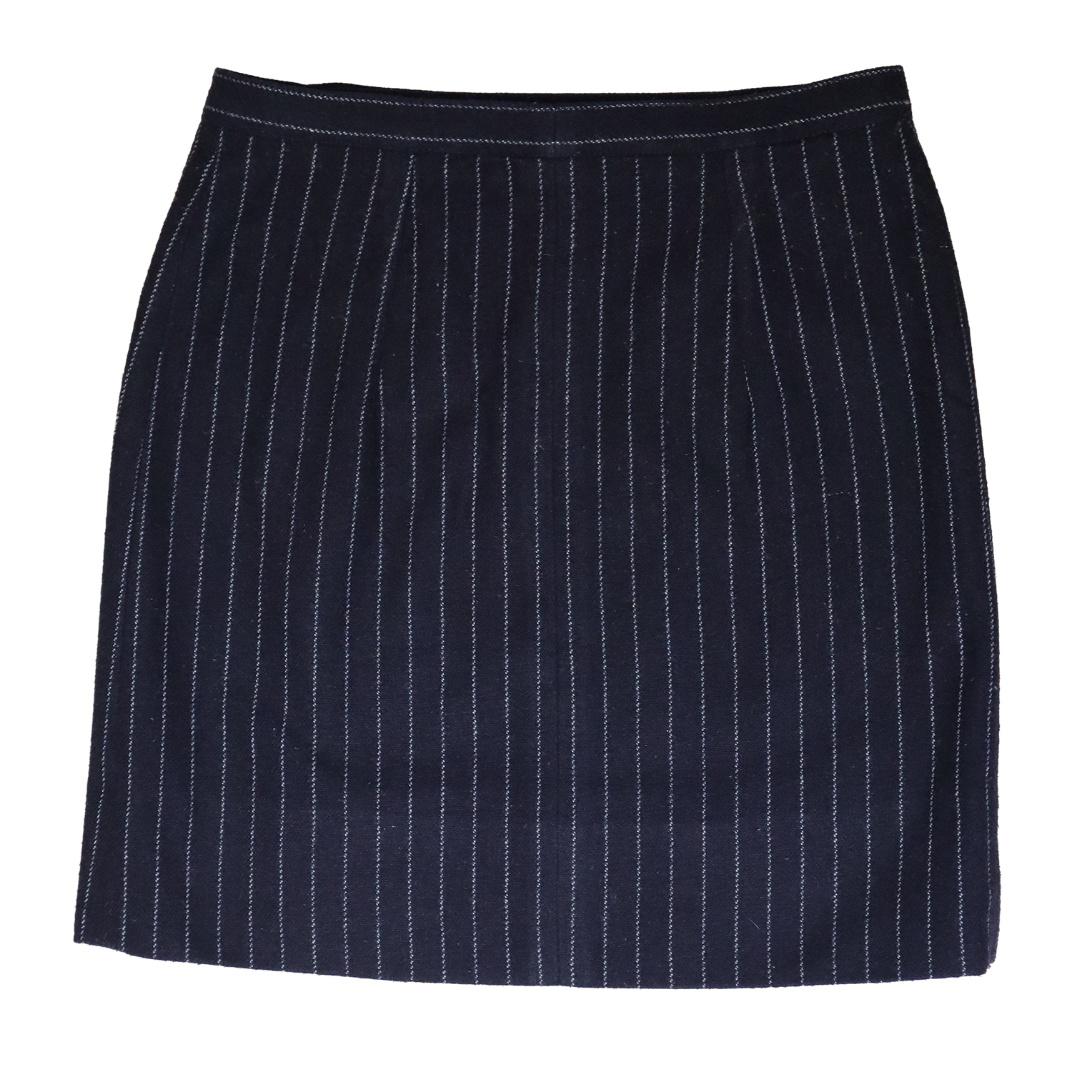 Jupe courte portefeuille avec détail doré. Bleu marine lignée. Plus d'étiquette de taille ou de marque. Matière épaisse. Très certainement taille S.