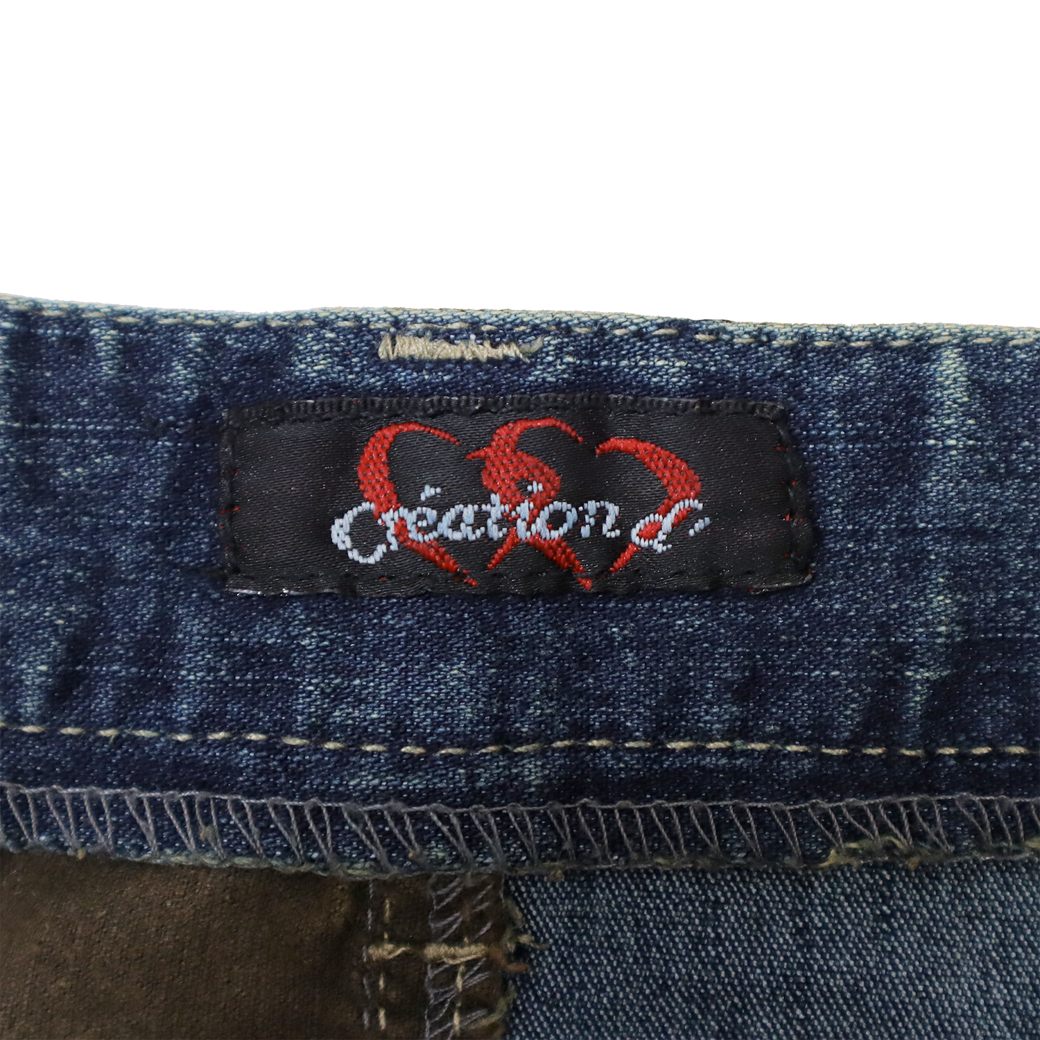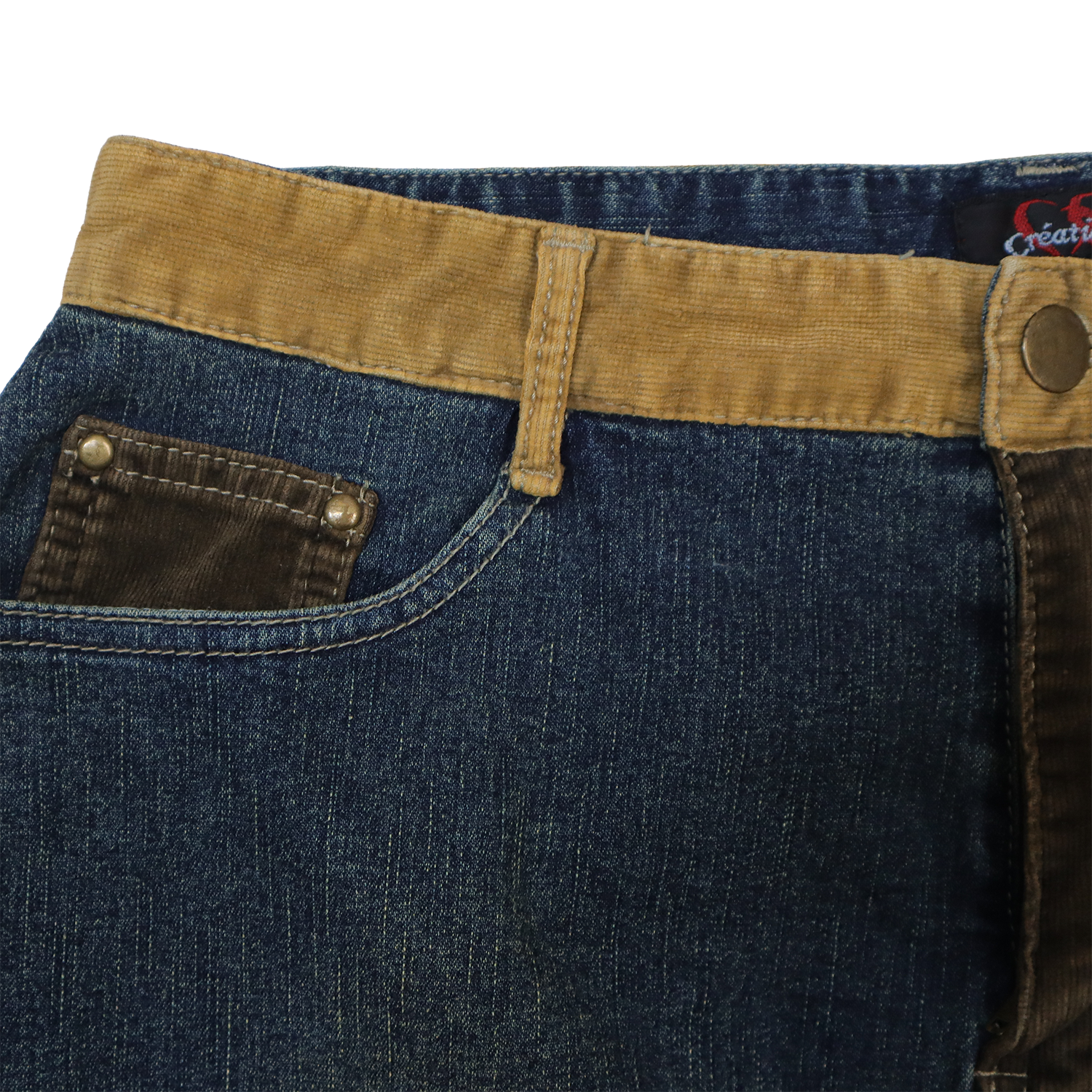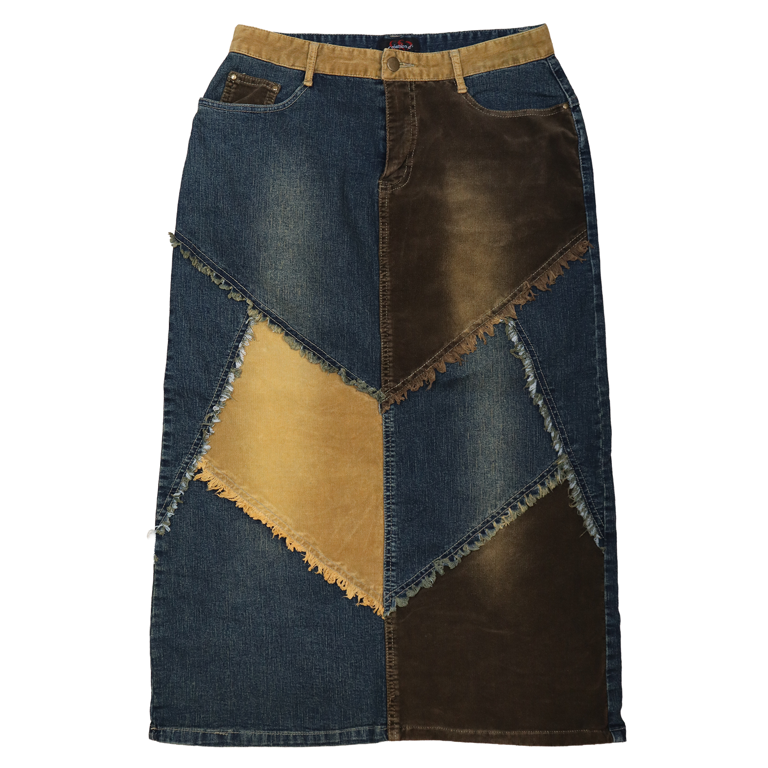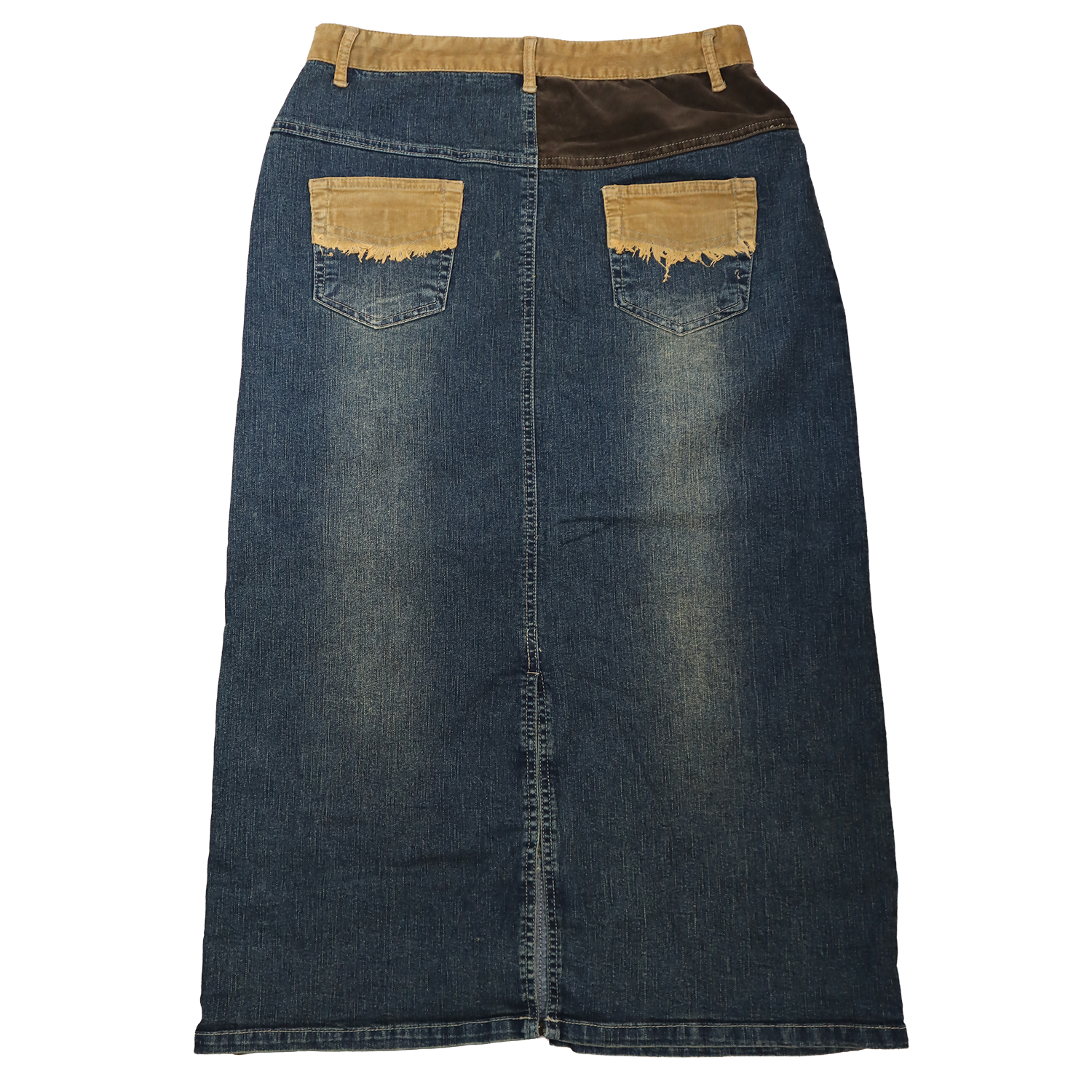 Jupe midi en denim et en velour côtelé. Design en denim japonais, avec des empiècements de différentes teintes. Jupe en denim avec poches. Fente à l'arrière bas de la jupe pour faciliter les mouvements. Pièce rare à se procurer.